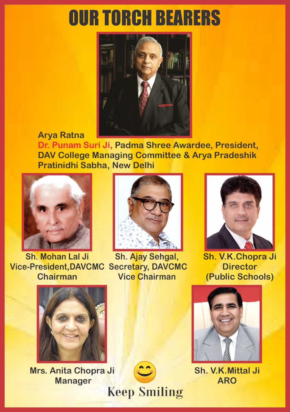 Arya Rattan Dr. Poonam Suri is the President of DAV College Managing Committee, New Delhi. He is a well known media personality, Managing Editor of Daily Milap, staunch Arya Samajist. He spread awareness to remain fit with a beautiful phrase ‘Keep Smiling’.